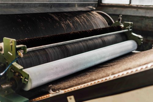 Because most felts are a combination of different fiber types, the varying materials are weighed and blended using a carding machine. The carding machine breaks up the clumps of fibers to create individual fibers aligned parallel to one another, forming a web.