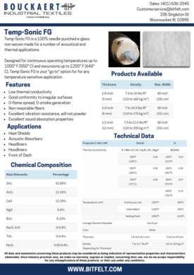 Temp-Sonic is a family of products from Bouckaert Industrial Textiles comprised of needle punched fiberglass blended with polyester or polypropylene for use as acoustical and/or thermal insulation. Whether you need a moldable acoustical absorber, a substrate to support aerogels or other chemicals or a flexible, high performance core for a heat-shield, Temp- Sonic is the choice for you.